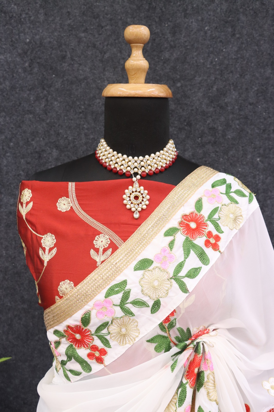 Elegant Off-White Georgette Saree with Intricate Embroidered Work